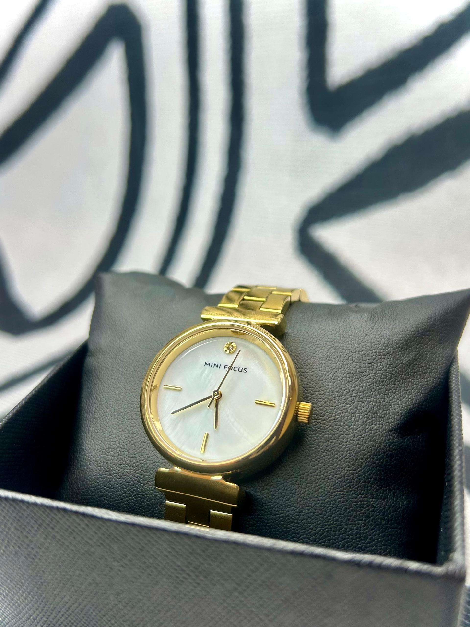 Elevate your everyday look with this elegant gold-tone watch by Mini Focus. Featuring a mother-of-pearl dial, crystal accent, and sleek minimalist design β it's the perfect blend of class and charm. π«